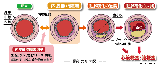 喫煙によるフリーラジカルの発生で血管内皮細胞が傷つき内皮機能障害に陥ることが、動脈硬化の一因です。